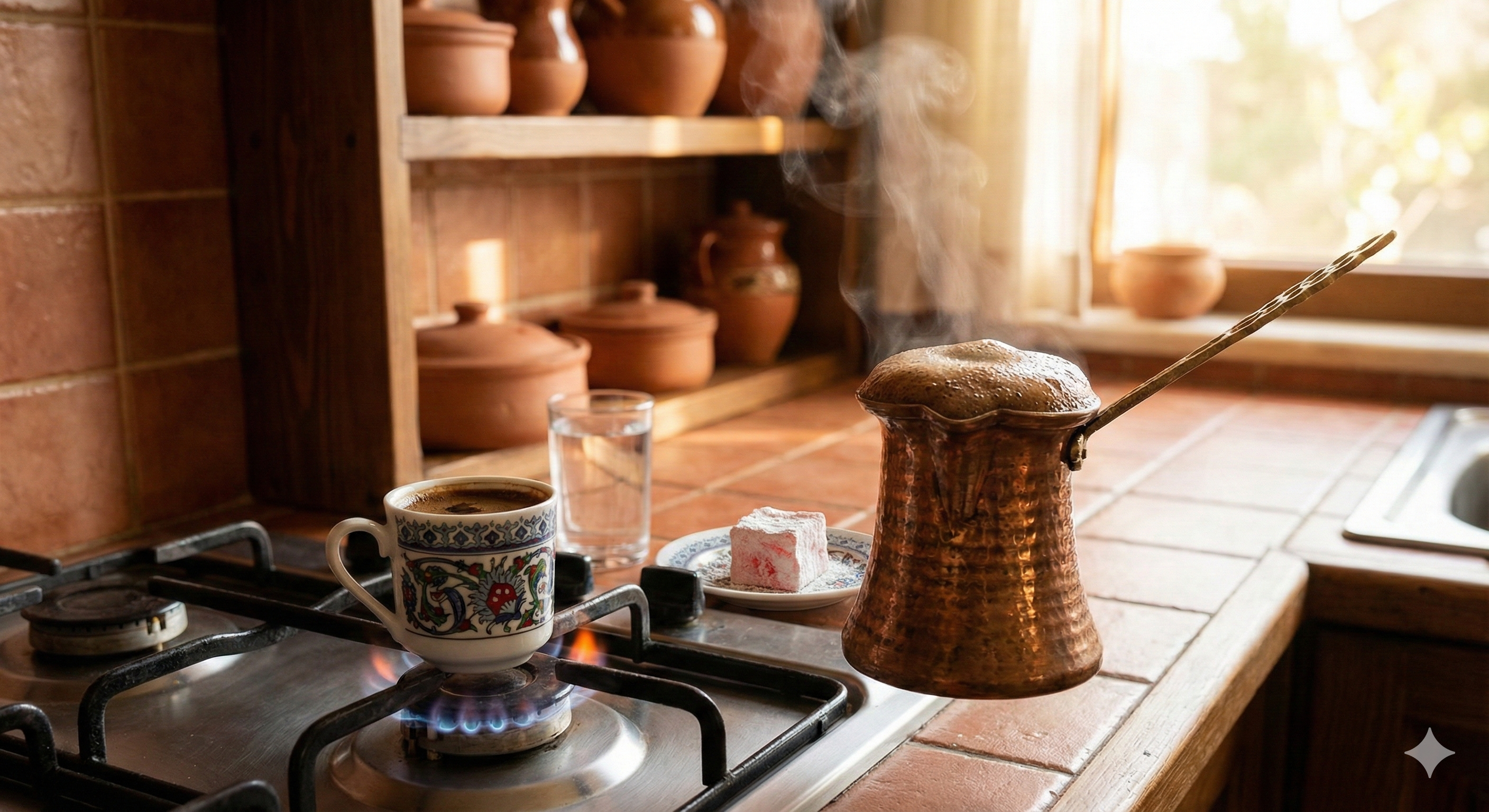 가장 핵심은 '체즈베(Cezve)'라고 불리는 긴 손잡이가 달린 작은 구리 냄비입니다. 열 전도율이 높고 입구가 좁아 거품을 모으기에 최적화되어 있죠.