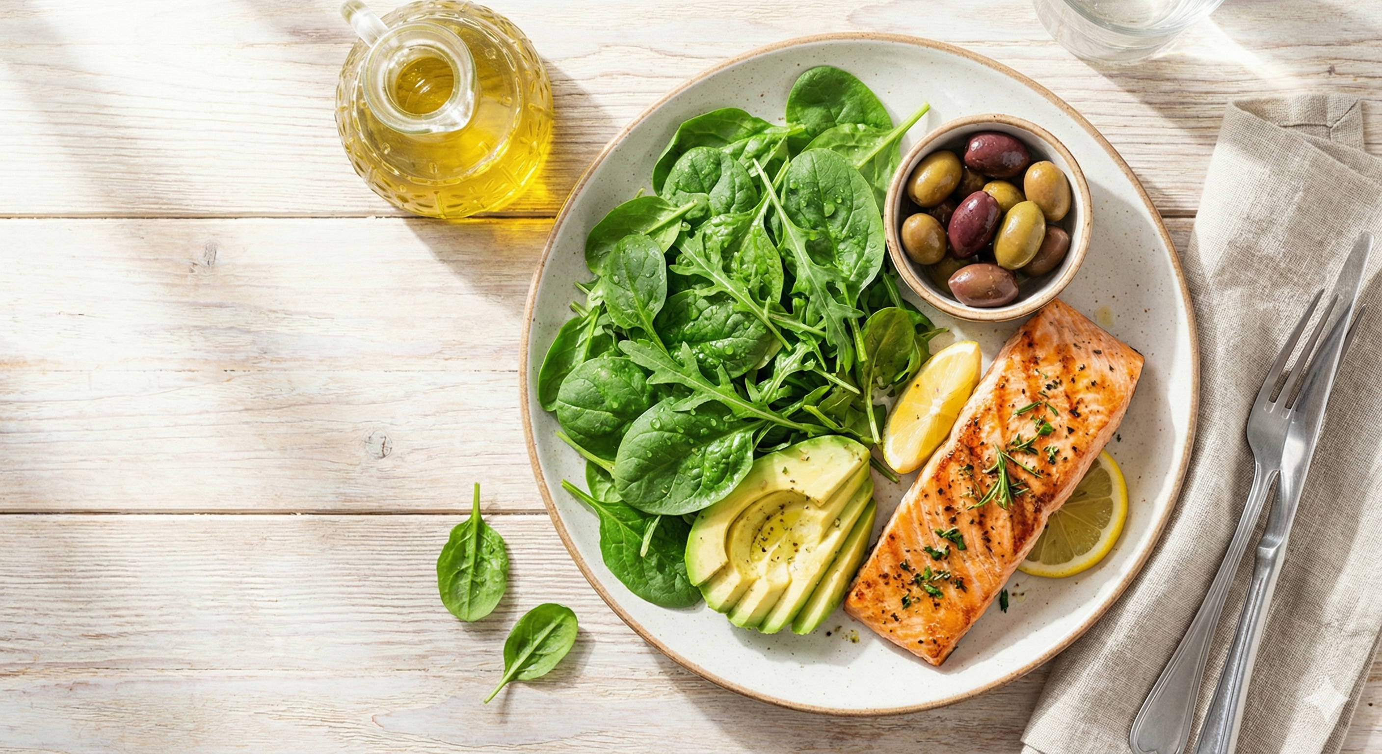 - 3. 접시의 25% (좋은 지방): 샐러드에 올리브유를 듬뿍 뿌리거나, 고기를 버터/기버터에 굽거나, 아보카도 반 개를 곁들입니다.